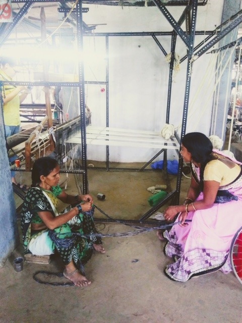 (カディ作りに励む女性たちも、みんなサリー着用)