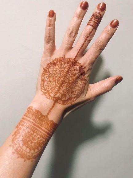 5~6時間後に、乾いたヘナを剥がすと、薄い朱色で模様が肌に残ります。