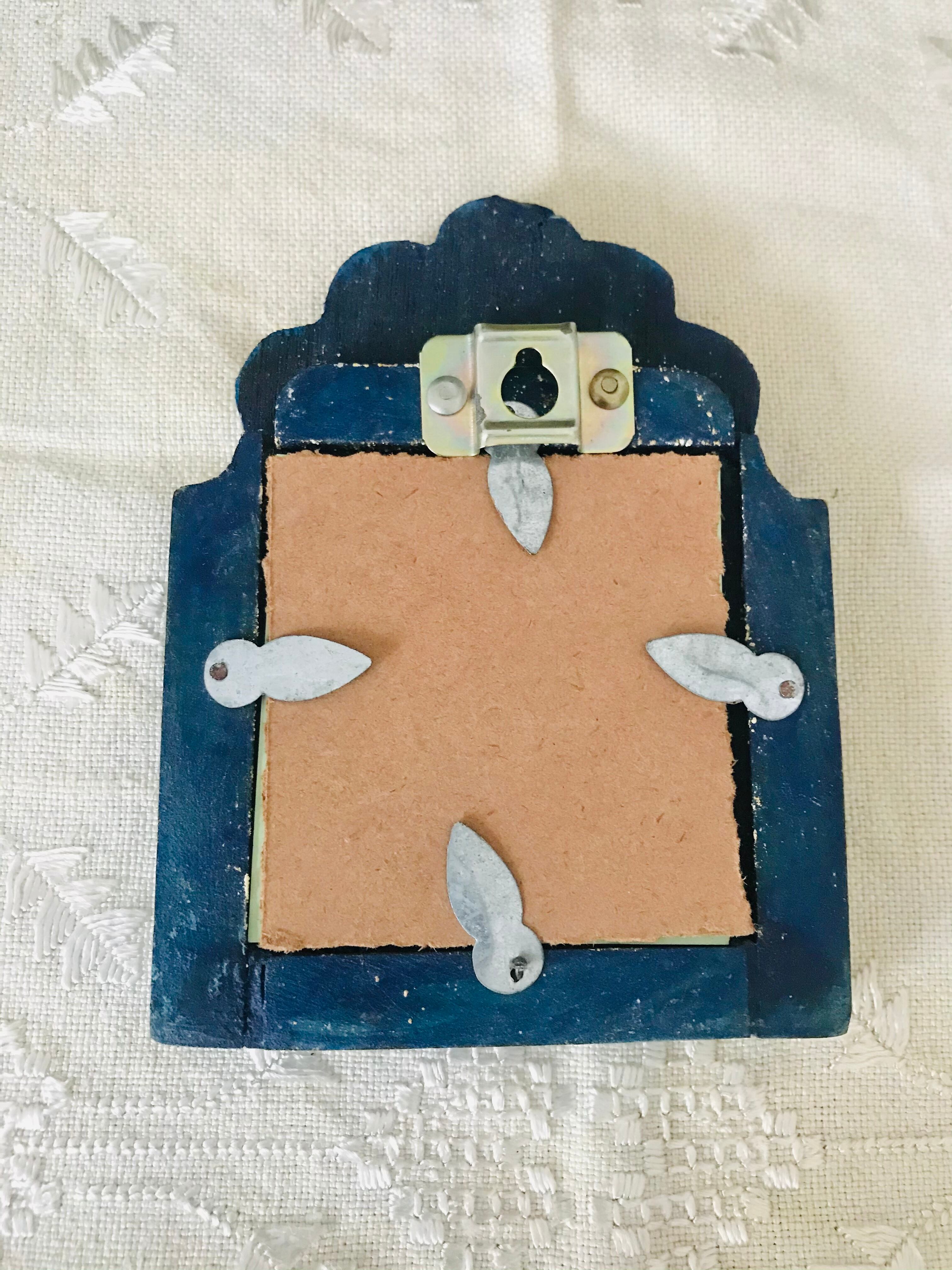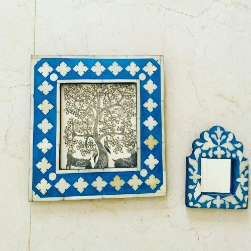 木製ベースに、動物の骨(主にキャメル)が植物をモチーフとしたデザインで埋め込まれてた、鮮やかなブルーとホワイトのコントラストが美しい、小さな鏡です。
