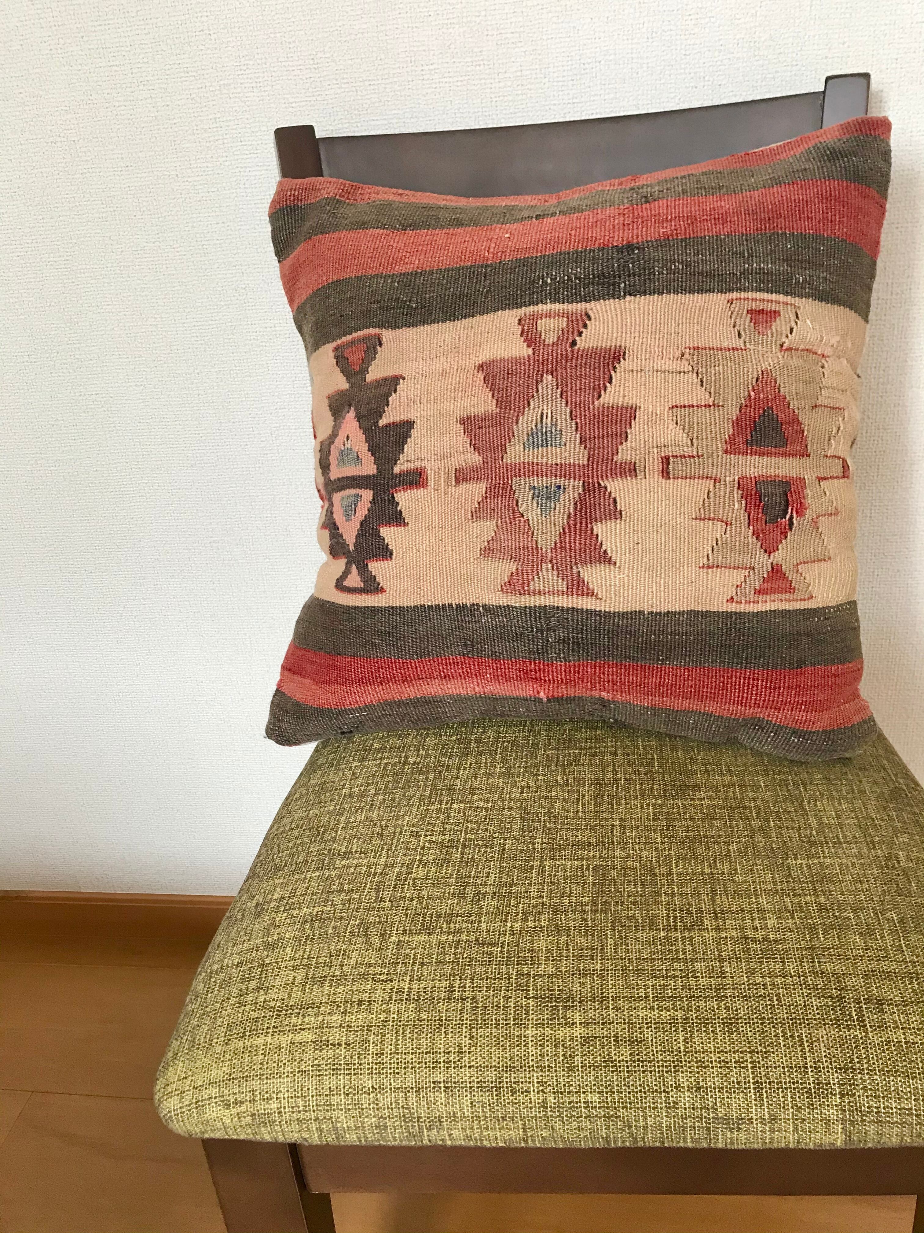優しい温かみのある色合いの、トルコ製のヴィンテージ・キリムのクッション・カバーです。