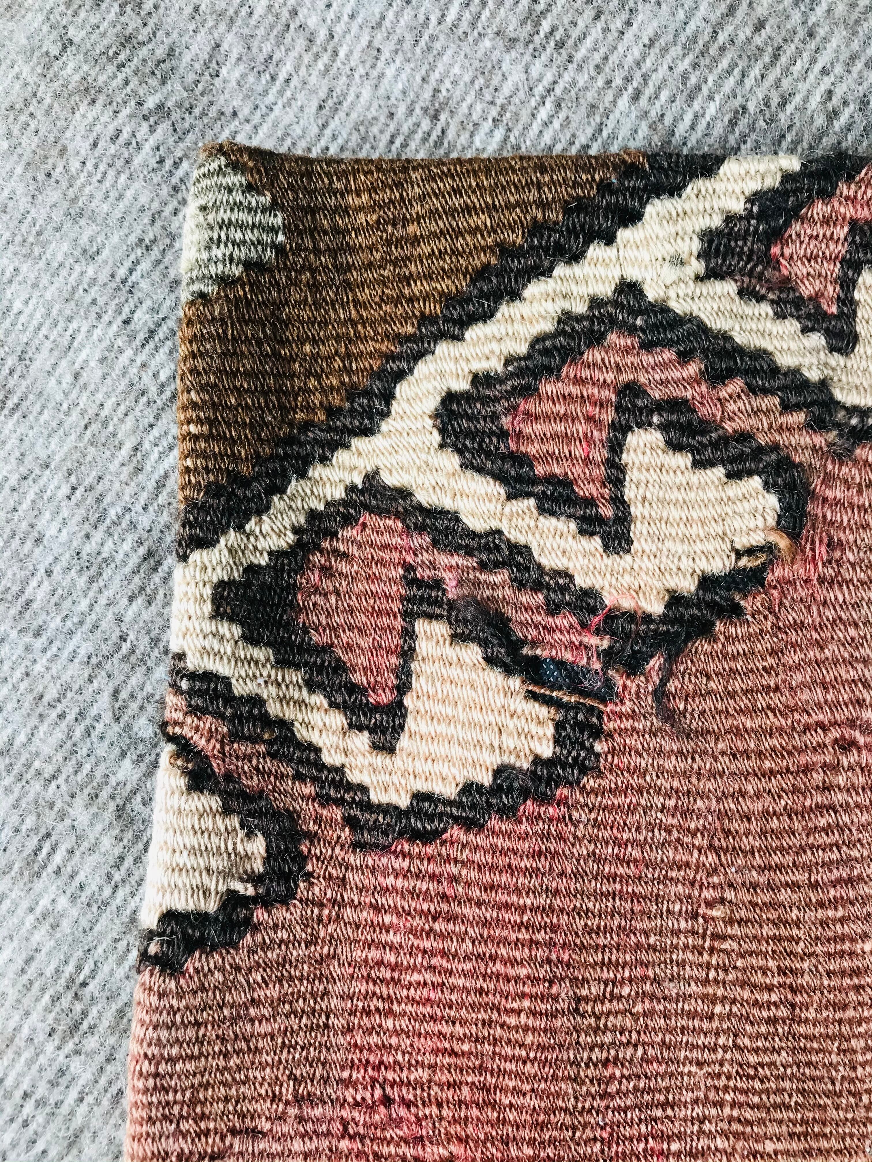 縫製はトルコで行われており、特徴のある織り方(アナトリアキリムは縦に隙間を作りながら織られます。)とアンティーク製品が故、色の褪せやシミ、ほつれ等がところどころ見られることをご了承ください。
