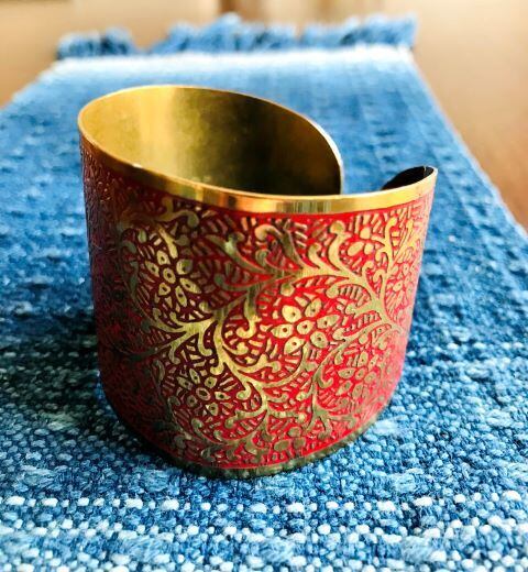 草花の模様が彫られた部分に加工された赤と、真鍮のコントラストが美しく、気品のあるアクセントになっています。柔軟性のある真鍮が使用された、手作りの製品のため、多少形に歪さと、ところどころに真鍮特有の黒っぽい色味があることをご了承ください。