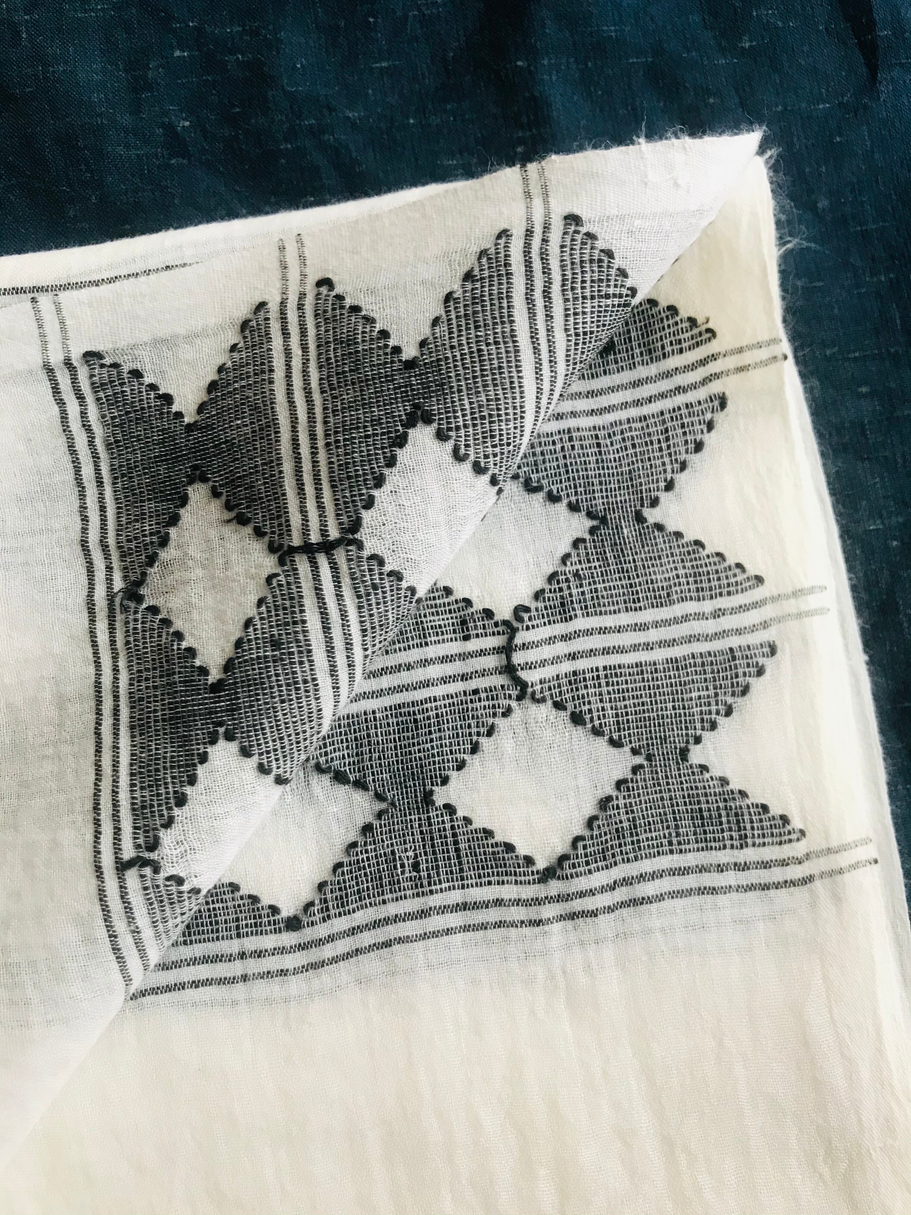 コットンで有名な、南インドのケララ州で作られた、手織りのオーガニック・コットンのショールです。細かい刺繍は手作業で施されています。