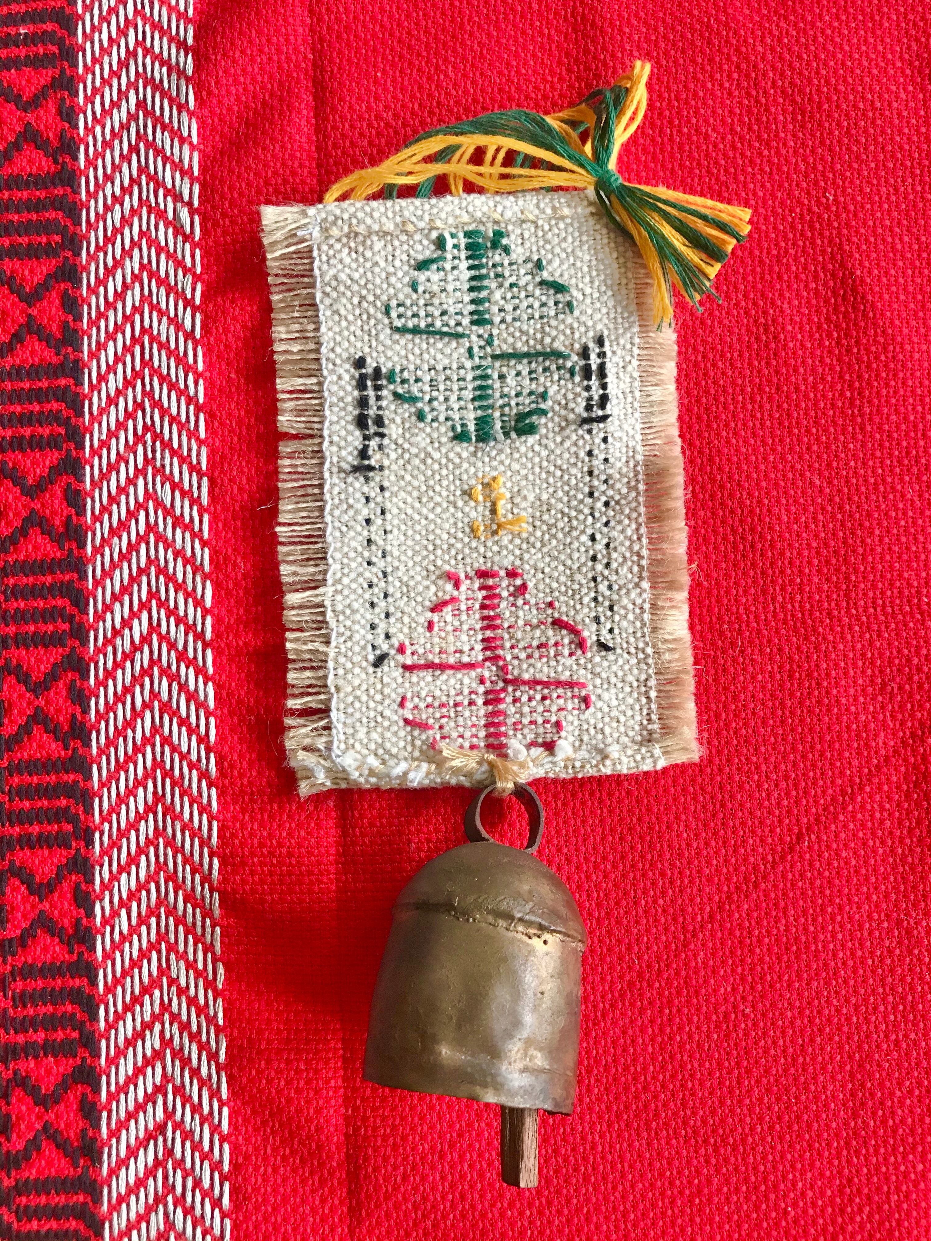 インド製 真鍮カウベル&刺繍ストラップ: Indian brass cow bell with a embroidered strap