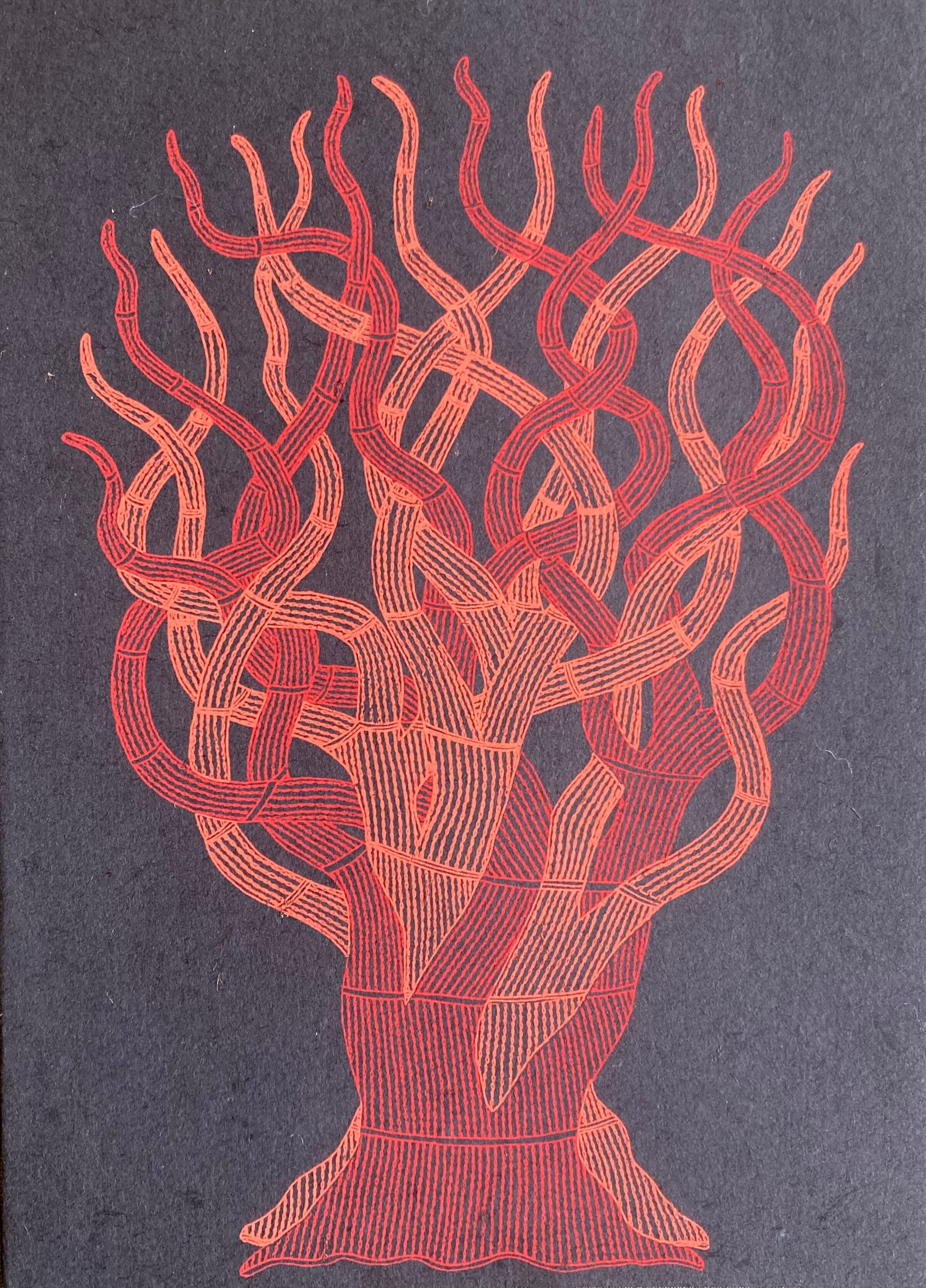 ゴンド・アートの代表作でもある絵本、「The Night Life of Trees」から「THE BINDING TREE」がスクリーンプリント(*版画の孔版形式での代表的な版種のひとつ)により手漉き紙に映し出され、美しいカードになりました。